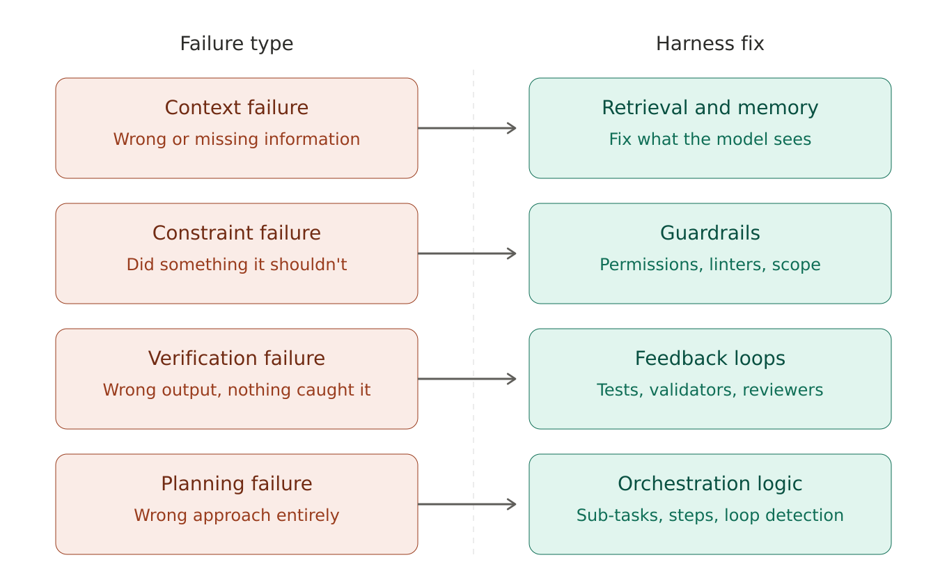 This classification turns vague "the agent messed up" conversations into targeted harness updates. Over time, each fix accumulates — the harness absorbs the failure and prevents it from recurring.