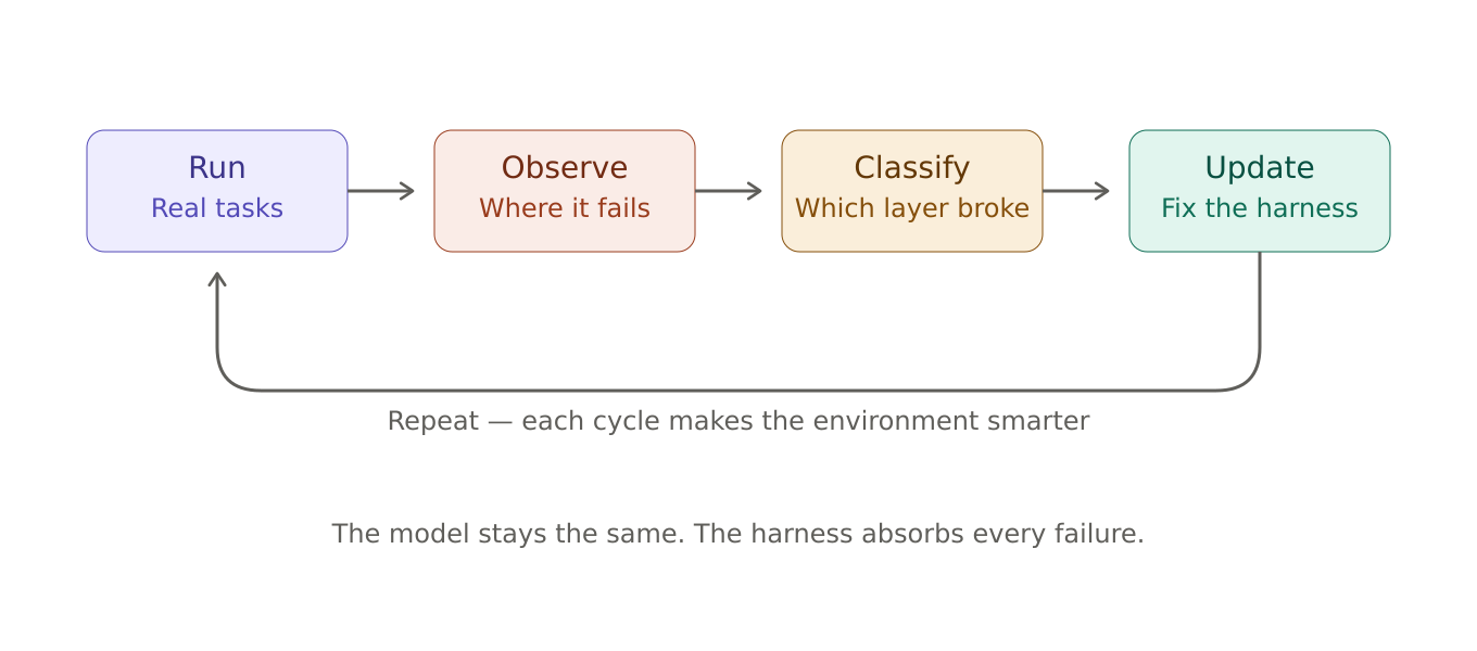 The core practice of harness engineering is an iterative loop: run the agent on real tasks, observe where it fails, classify the failure, update the harness, and repeat. Every cycle makes the environment smarter, even when the model stays the same. This is the insight that made Hashimoto's framing stick — you're not debugging the model, you're debugging the environment.