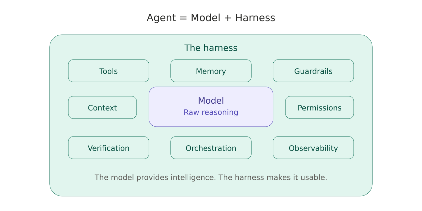 That system is the harness, and the formula is simple: Agent = Model + Harness. The model provides intelligence. The harness provides everything else: tools, memory, constraints, verification, and orchestration. This post explains what an agent harness is, why it matters more than your model choice, and how to engineer one for your use case.